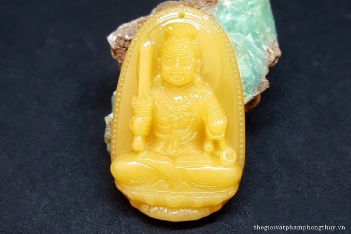 Trong kinh phật có ghi lại, Ngài tay phải mang kiếm có liệt hỏa rực sáng tượng trưng cho sức mạnh của sự bảo vệ. Tay trái ngài mang nhành hoa sen hoặc viên ngọc sáng biểu trưng cho sự thông tuệ và tâm trong sáng.