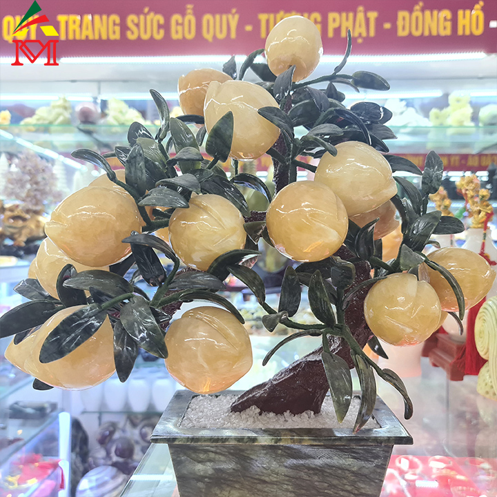 - Cây đào tiên xum xuê tài lộc đẹp lung linh, sinh động. Cây có trái đào tiên bằng ngọc hoàng long, lá cây bằng đá ngọc xanh tự nhiên, chậu cây được làm từ đá thạch anh nguyên khối.