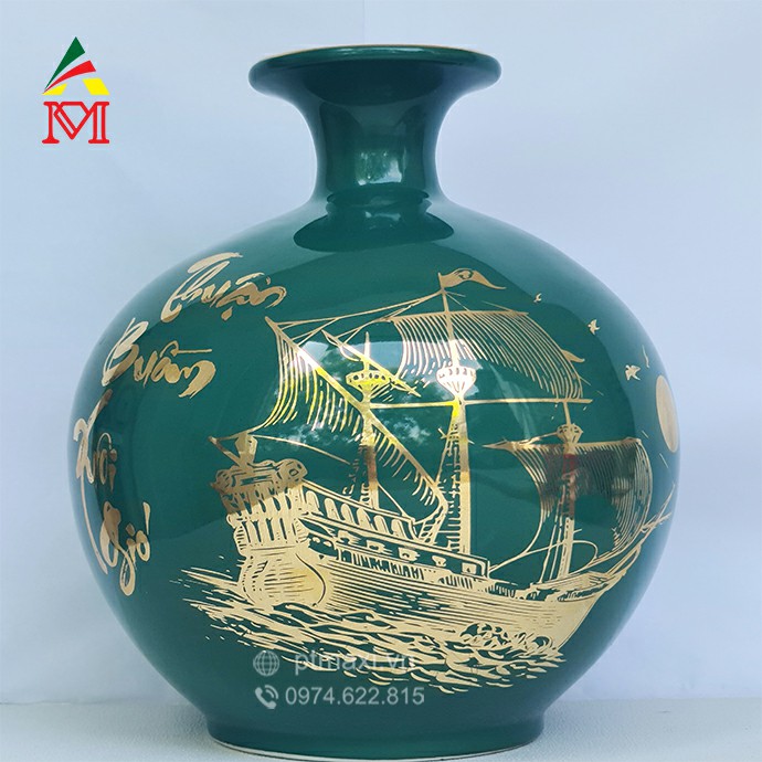 Bình Gốm Sứ Bát Tràng Xanh Ngọc Vẽ Thuyền Thuận Buồm Xuôi Gió