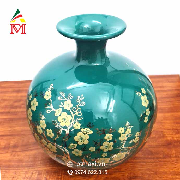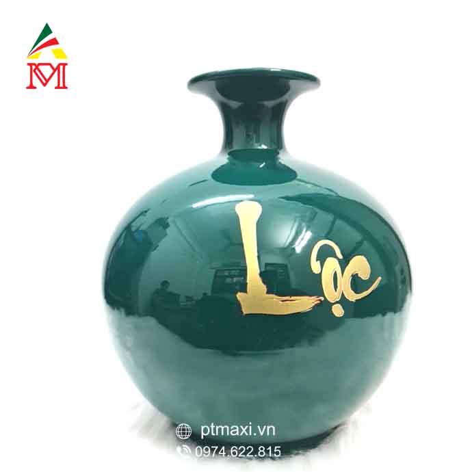Bình Gốm Sứ Xanh Ngọc Vẽ Chữ Lộc Vàng Sứ Bát Tràng Vẽ Vàng 24K