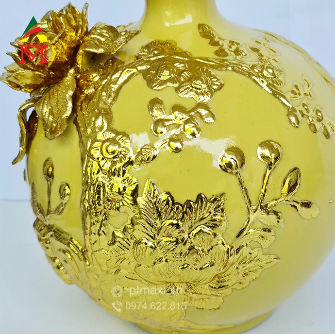 - Với màu gốm Vàng đặc trưng, hoa văn được khắc nổi trên thân bình, với những đường nét uyển chuyển tinh tế.