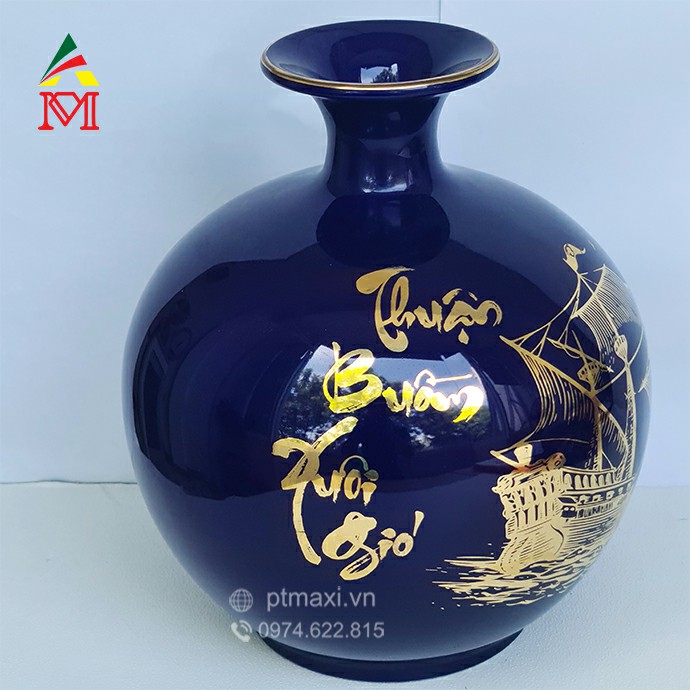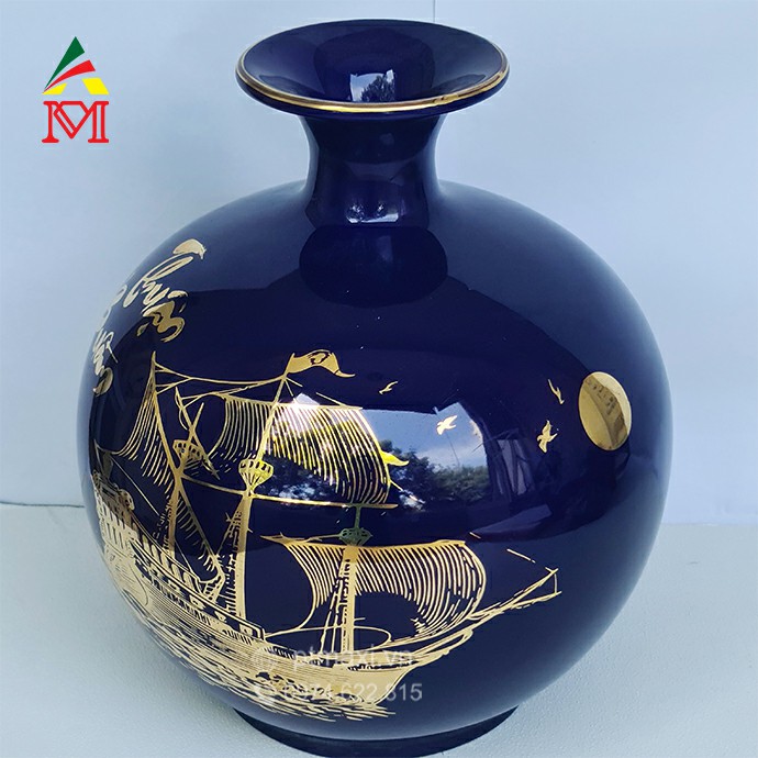 Bình Gốm Tím Xanh Vẽ Thuyền Buồm Vàng Hút Tài Lộc Sứ Bát Tràng Vẽ Vàng 24K