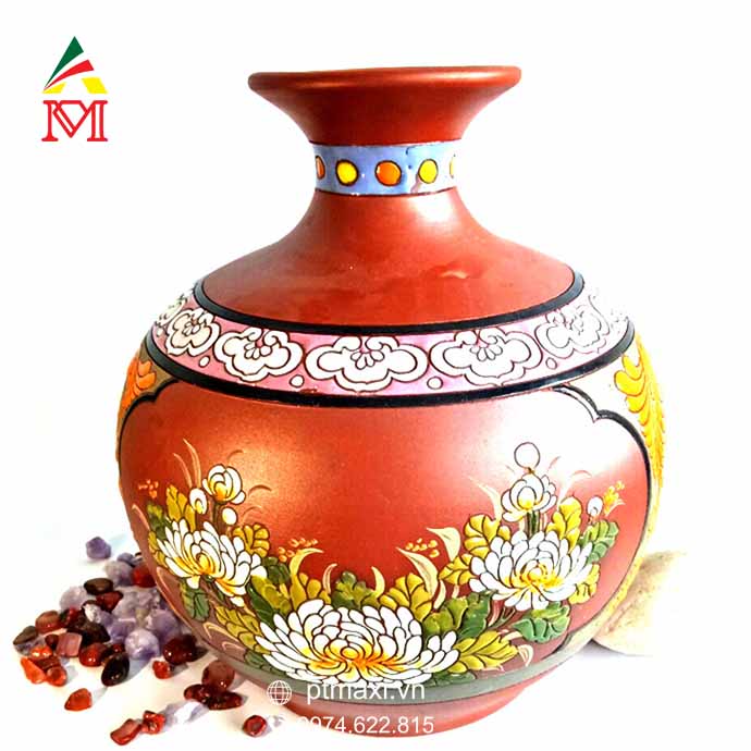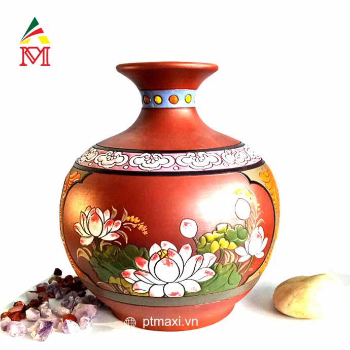 - Với màu gốm đỏ đặc trưng, hoa văn được khắc nổi trên thân bình, với những đường nét uyển chuyển tinh tế.