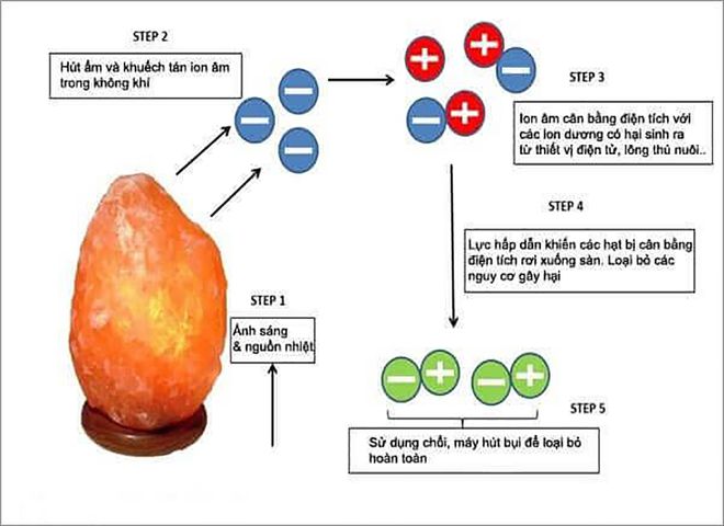 Đèn đá muối Himalaya được mệnh danh là “máy lọc không khí tự nhiên” đem đến công dụng chăm sóc sức khỏe diệu kỳ. Đá muối Himalaya có chứa đến 84/ 92 loại khoáng chất có lợi cho sức khỏe, khi đèn được thắp sáng đá muối sẽ nóng lên, những tinh thể muối sẽ hút các phân tử nước từ không khí, tạo ra sự hòa tan chất natriclorua (muối) và nước. Nguyên tố Natri là các hạt ion dương, và Clorua là ion âm. Khí Hydro có chứa 2 phần là ion âm và khí Oxy là hạt ion dương. Những hạt ion này tạo ra sự tác động và phản ứng của 2 ion dương và 3 ion âm. Sau khi loại bỏ nhau ra ngoài, chỉ còn một hạt ion âm được sản xuất. Hạt ion âm này sẽ tìm kiếm bên ngoài những hạt ion dương như bụi, vi khuẩn và trung hòa với chúng. Đây chính là cơ chế hoạt động của đèn đá muối Himalaya khiến nó được biết đến với công dụng thanh lọc không khí tuyệt vời.