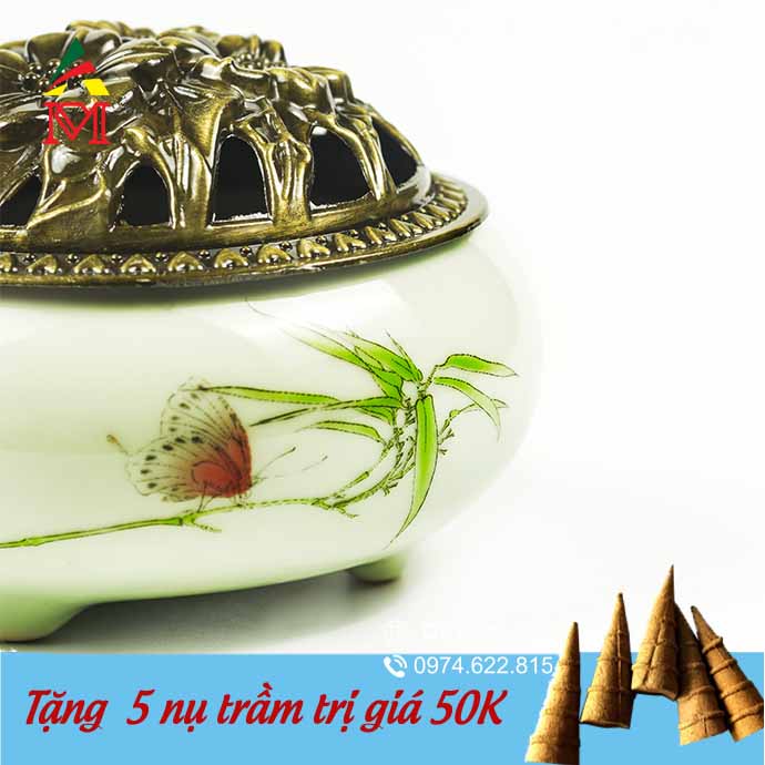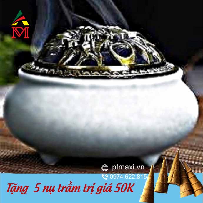 Lư hương đốt trầm gốm sứ cao cấp trắng xanh