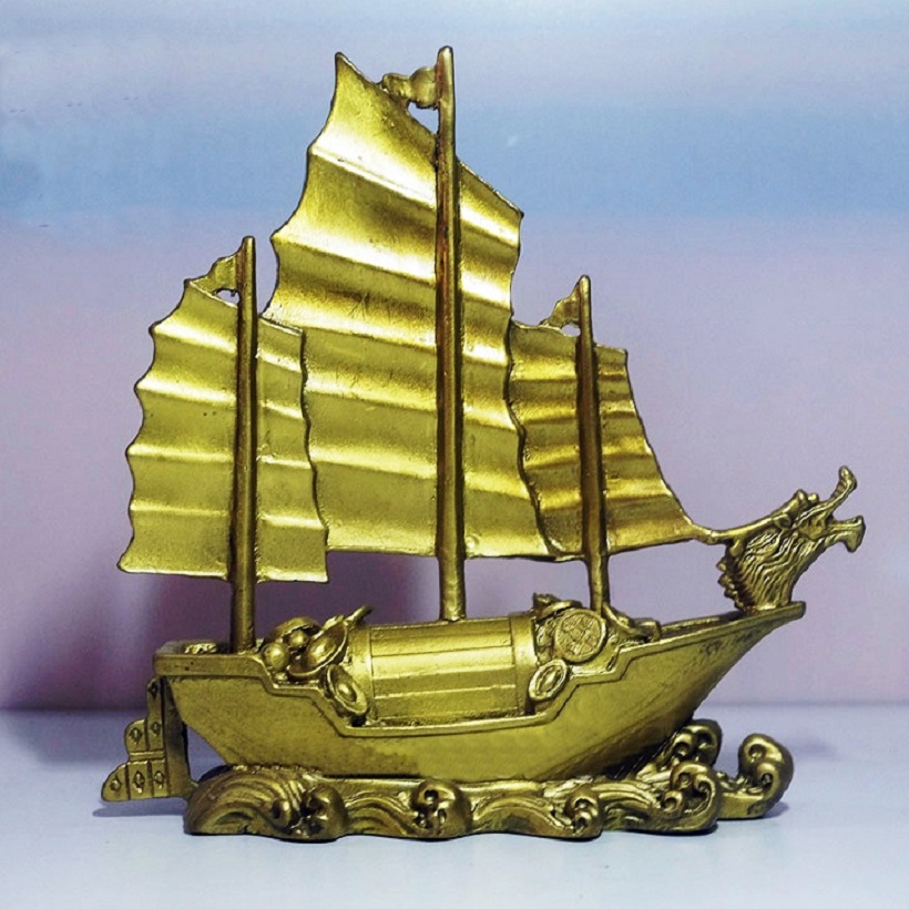 - Thuyền buồm có nghĩa là thuận buồm xuôi gió được chế tác từ chất liệu đồng vàng và đỏ trong ngũ hành tương sinh tương khắc thì đồng là kim loại thuộc hành Kim phù hợp với những người mệnh Thủy ( Kim sinh Thủy ), hơn nữa hình ảnh cánh buồm lướt trên những con sóng lớn đại dương đại diện cho biểu tượng của Thủy.