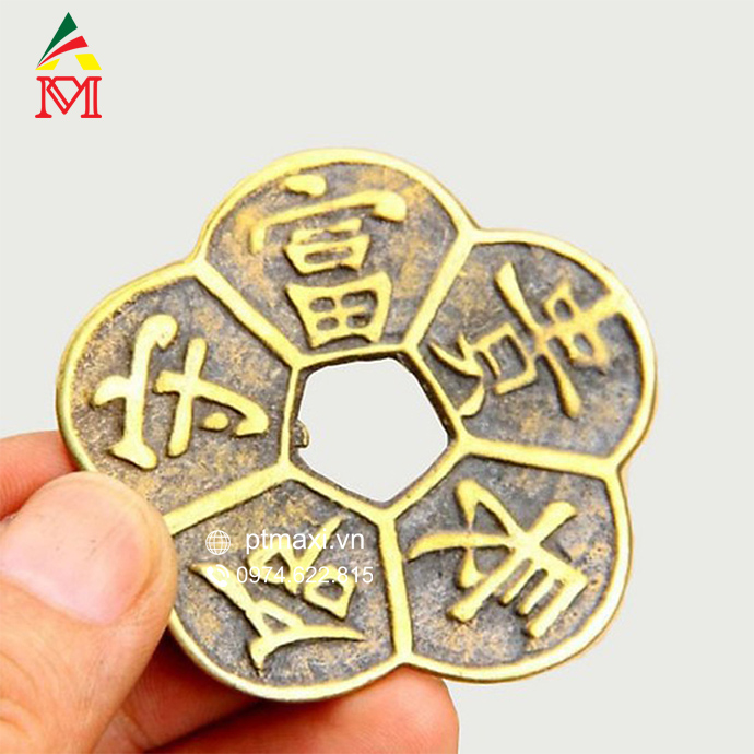 - Ý nghĩa: Trong phong thủy, Đồng tiền hoa mai là một trong số các loại tiền xu có ảnh hưởng quan trọng đến tài lộc và vận số may mắn của con người. Như một đóa hoa với 5 cánh gắn kết với nhau tượng trưng cho 5 mệnh Kim - Thủy - Thổ - Hỏa - Mộc trong Ngũ hành, tiền Mai Hoa thường được treo thành từng cặp. Mỗi một đôi với hai bông 10 cánh hoa tạo nên sự thập toàn, tức sự hoàn hảo, vẹn toàn. Đây được coi là một vật khí dùng để trấn yểm hung khí, tà khí xấu và nhờ đó thu hút, đem lại vận khí tốt lành, thịnh vượng, tiền tài và danh lộc. Do vậy, nó được sử dụng rất nhiều không chỉ trong gia đình mà còn trong kinh doanh, buôn bán với công dụng đa năng như tránh chuyện thị phi, kiện tụng và giải trừ kẻ tiểu nhân.