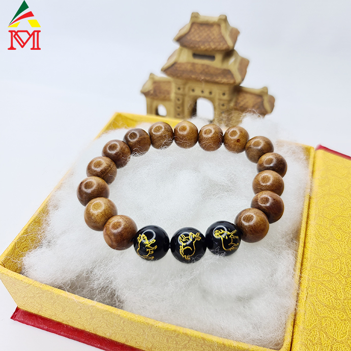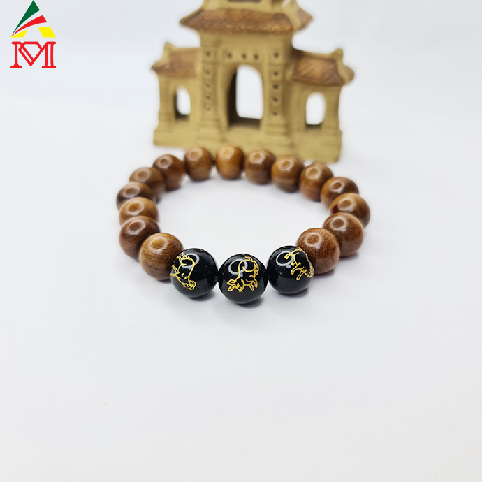 Vòng Tay Tam Hợp Hợi - Mão - Mùi Mã Não Đen Đan Gỗ Bách Xanh Tự Nhiên