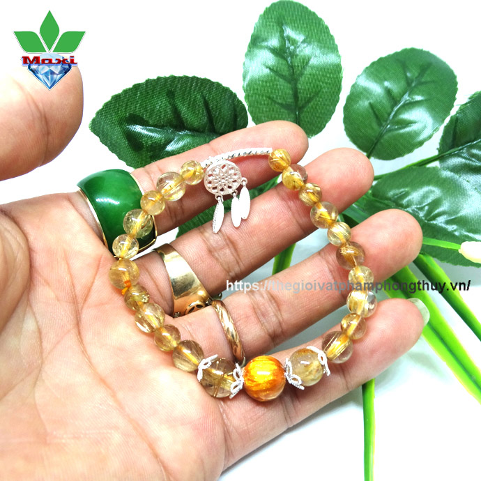 Ý Nghĩa Vòng Tay Thạch Anh Tóc Vàng Charm Gỗ Dương Liễu và Lưới Giấc Mơ (Dreamcatcher) Bạc 925 - 1DL