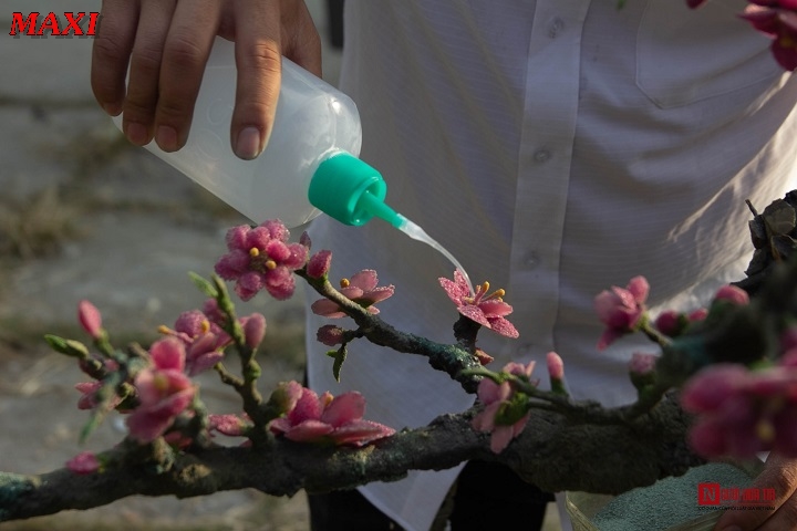 Cây đào được làm trong vòng 8 năm, trải qua nhiều lần cải tạo. Để có 1 cây đào đá quý trông thật nhất chị Hương đã phải tham khảo ý kiến của nhiều chuyên gia cây cảnh, những người trồng đào lâu năm tại khu vực Nhật Tân đến tư vấn về dáng cây, kĩ thuật, chi tiết cần chú ý.