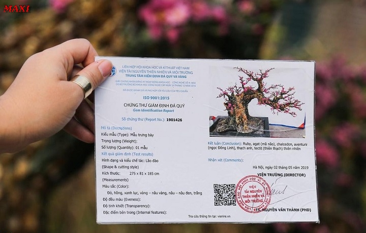 Chứng nhận đá quý được cấp bởi Trung tâm kiểm định đá quý và vàng của viện Tài nguyên Thiên nhiên và Môi trường.