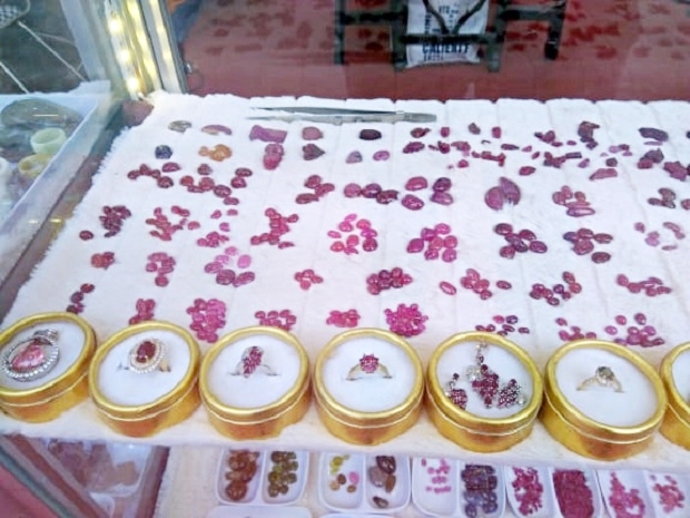 Các hạt đá quý, đá ruby mới qua tinh chế thô.