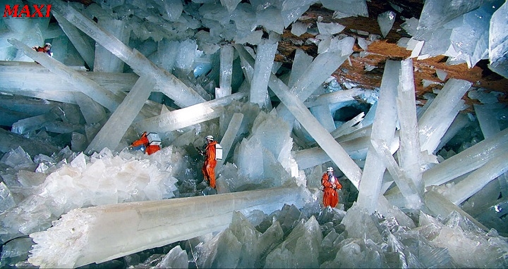 Hang Naica ở Mexico nổi tiếng với hàng nghìn khối đá thạch anh khổng lồ mọc ra tua tủa, đây là kết quả của quá trình cô đặc muối canxi trong nước.