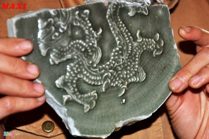 Mảnh đĩa gốm men ngọc chạm nổi hình rồng quý hiếm do ngư dân tìm thấy.