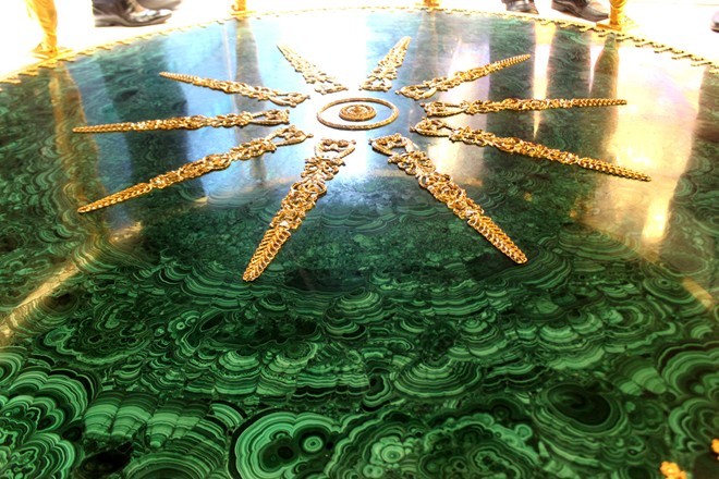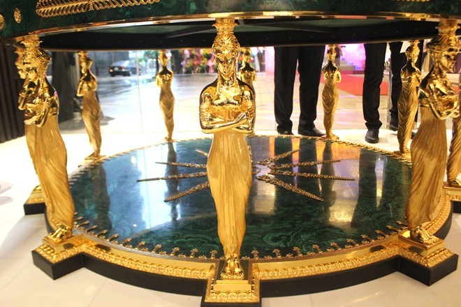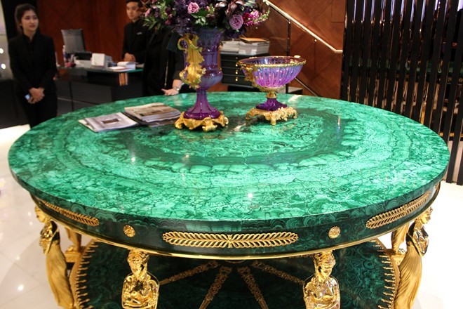Chiếc bàn thứ hai được làm bằng đá màu xanh ngọc mang phong cách Hoàng gia Nga. Giá chào bán sản phẩm này cũng trên 8 tỷ đồng