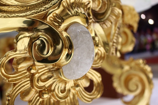 Những viên đá quý được khảm theo viền chân. Chiếc bàn này đang được chào bán với giá 8,26 tỷ đồng. Tuy nhiên, theo lời một khách hàng có kinh nghiệm về lĩnh vực nội thất, mức giá hơn 8 tỷ đồng là khá cao trong ngành hàng nội thất xa xỉ ở Việt Nam. Anh này cho rằng, giữa thời buổi kinh tế khó khăn như hiện nay, việc bán chiếc bàn không dễ.