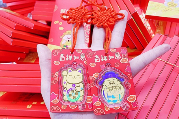 Chị Bùi Thị Thắm (Công ty TNHH Vàng bạc Đá quý) cho biết: “Đáp ứng thị hiếu của khách hàng, chúng tôi đã đặt rất nhiều mẫu mã phong phú như: Bao lì xì in hình con giáp của năm bằng vàng thật hay những biểu tượng phong thuỷ như: Ngựa, tì hiu, ếch ngậm vàng hay ông thần tài…