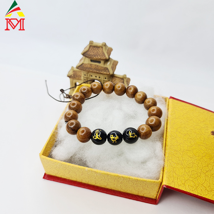 Vòng Tay Tam Hợp Tỵ - Dậu - Sửu Mã Não Đen Đan Gỗ Bách Xanh Tự Nhiên